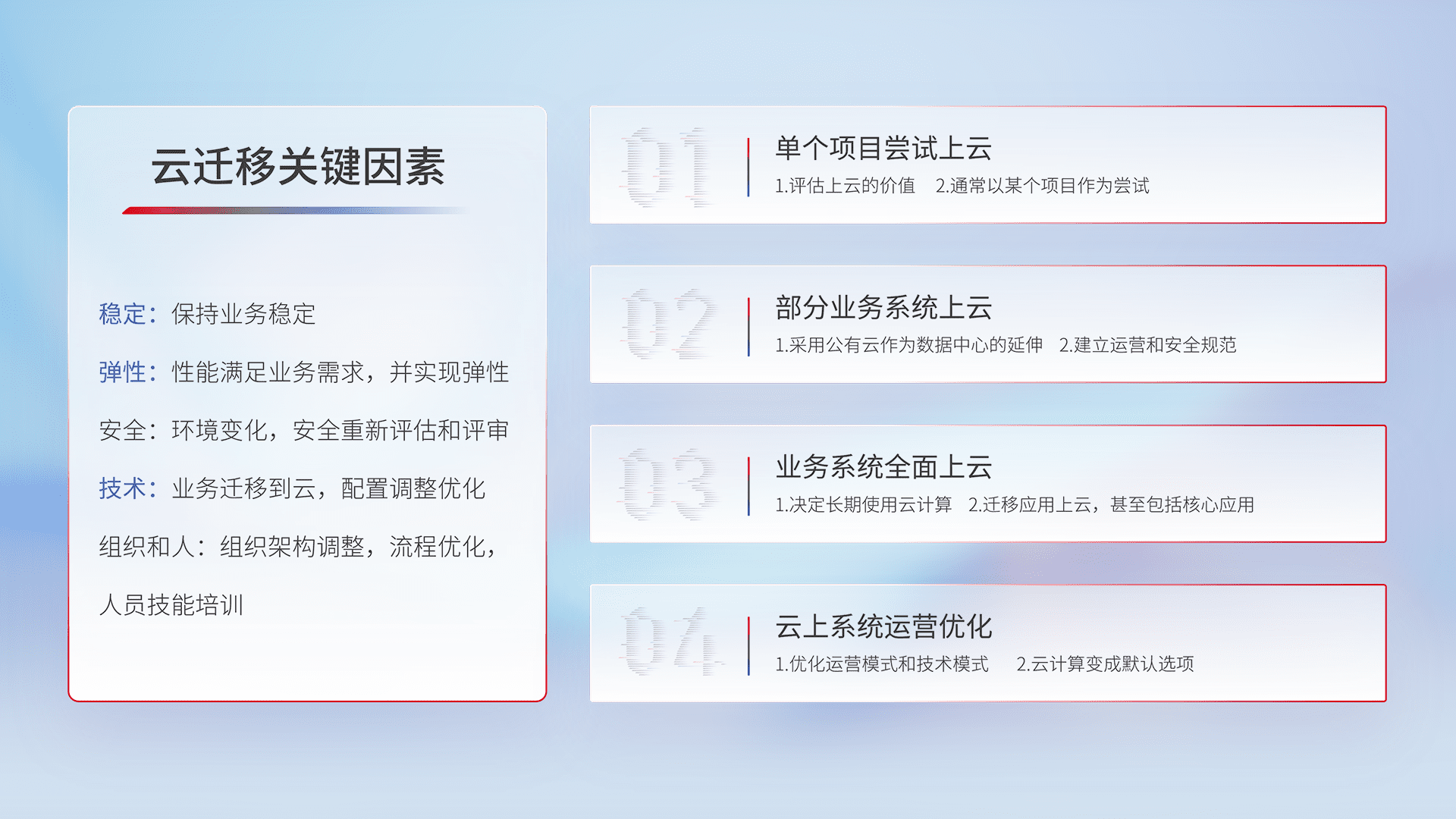结合实际业务,,从规划设计、、、、云平台选型、、、、云原生改造、、、、数据迁移、、集成交付,,,,迁移全过程为客户识别最佳上云路径,,做好风险识别管理,,设计网络架构、、、、身份权限、、安全审计合规、、、、操作审计、、、、日志审计、、、、监控告警策略、、多站点容灾设计等,,,,对云上基础设施进行整体规划,,,,提升IT治理水平,,,,以满足弹性、、高可用、、、、高性能的需求。。