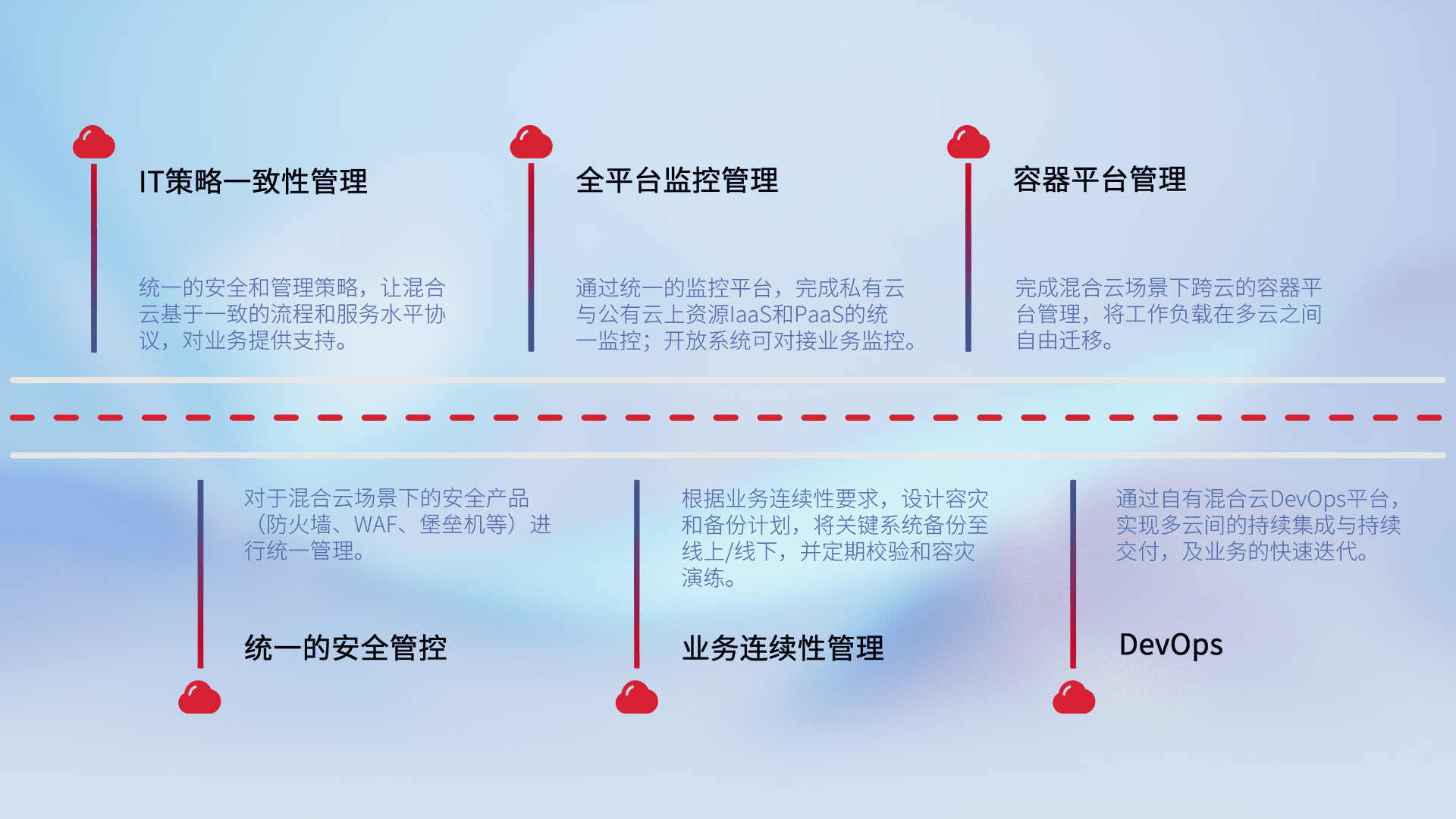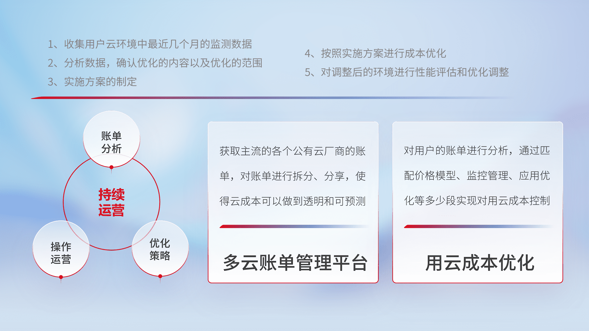 通过多云纳管,,,以统一的资源数据模型把客户的云资源进行抽象和封装,,进而实现对多云资源的统一操作,,保障云资源管理的可靠性、、、、稳定性与可用性。。量身定制化运维内容,,配置、、、、开发运维、、、、补丁管理、、备份、、、、监控、、、、认证和访问管理、、审计和日常巡检等,,保障在用云过程中的可靠度,,,,稳定度以及高可用率。。